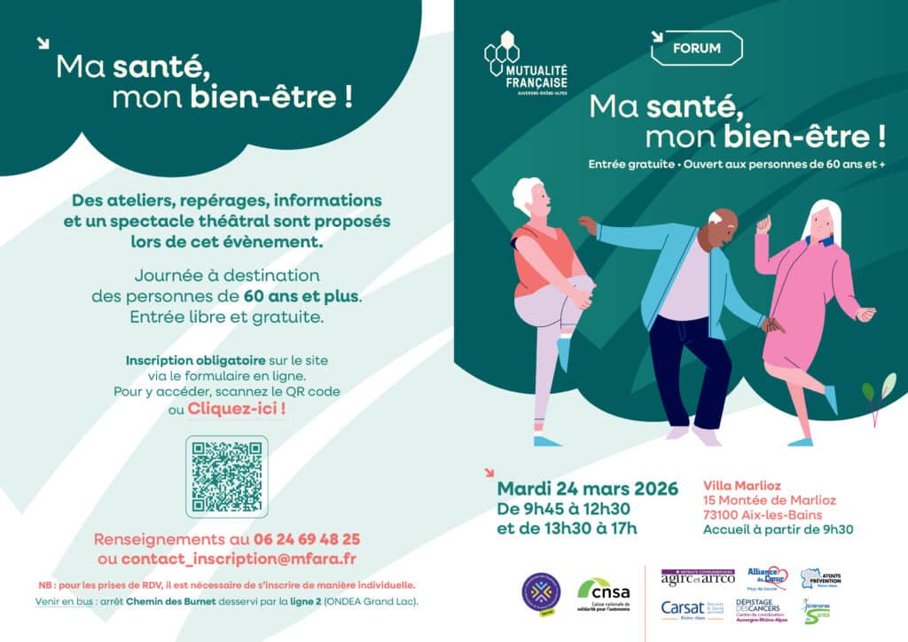 Le service Prévention et Promotion de la Santé de la Mutualité française Auvergne-Rhône-Alpes, avec le soutien de la Commission des financeurs de la Prévention et de Perte d’autonomie de la Savoie et la Caisse nationale de solidarité, vous invite à son action à destination des personnes de 60 ans et plus en Savoie :