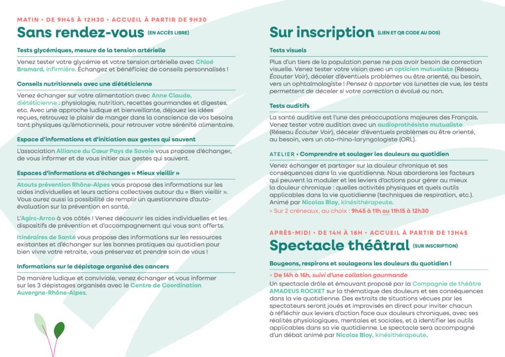 – bénéficier d’informations et d’échanges autour : des gestes qui sauvent par Alliance du Cœur Pays de Savoie, du bien vieillir avec AGIRC-ARCCO, Atouts Prévention Rhône-Alpes et Itinéraires de Santé et sur les dépistages organisés des cancers avec le Centre de Coordination Auvergne-Rhône-Alpes